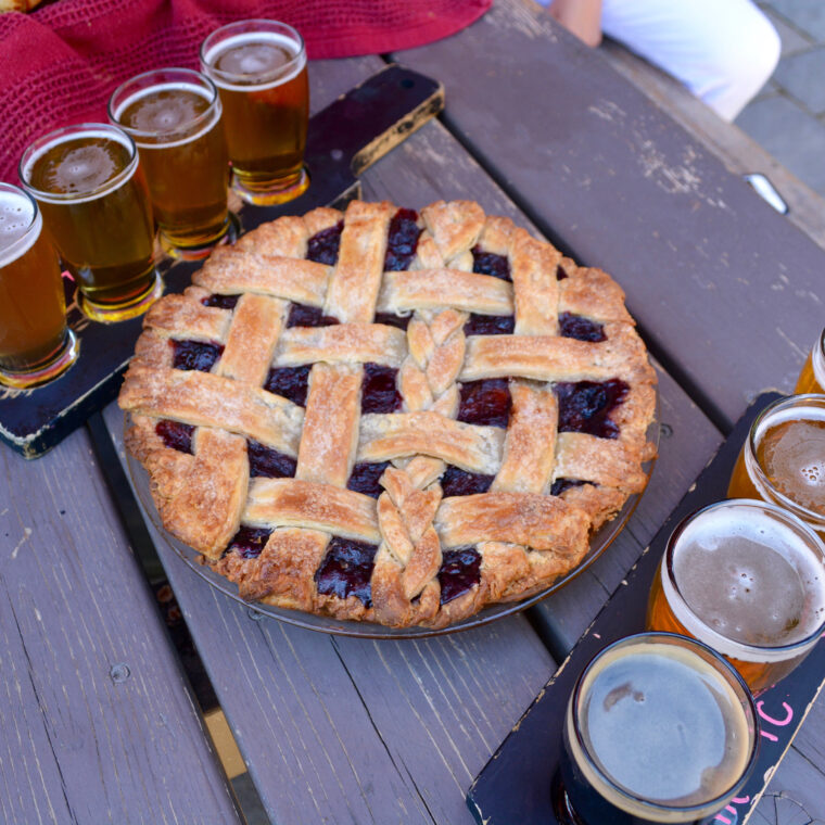 Jessica showed up shortly after I, quickly unveiling a gorgeous apricot cherry pie, complete with a lattice top with a braid running through the middle.  Our mouths started watering right there.  Can we have dessert first?  Then came the basket of hatch chile pepper, cheddar, onion, and garlic bread, and a vegetable strewn quinoa tabbouleh salad.  We decided to sate our salivation first with a beer flight.  Eight beers from the Bale Breaker playbook later, we delved in.