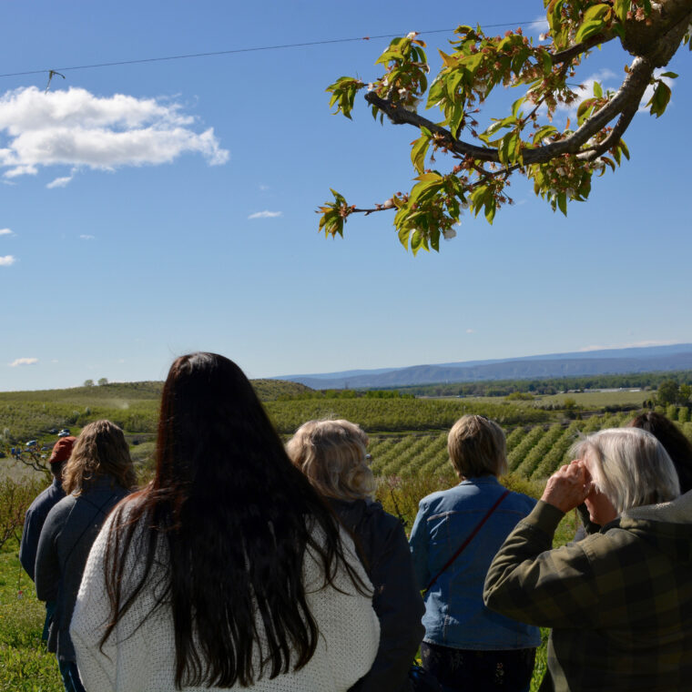 We started our day at a beautiful pocket of land in the Konnowac Pass area in between Moxee and Wapato, Washington called the Sunnyslope Ranch. After a friendly greeting by owner Rebecca Hunt, she walks us down into the orchard and explains who they are and what they do. An all organic orchard operation, largely cherries and stone fruit, they have created a niche for themselves by having a clear idea of who they are and how they want to be identified. They are the small, family, organic farm, and want to sell their goods to buyers who value that type of production, such as the New Seasons Market. Because of their size and the fact that they sell within the Northwest, they are able to pick when the fruit is more ripe, (rather than the early picks many of the volume producers have to do for longer shipping destinations), resulting in a beautiful, sweet, premium product. She said there is also a market for her less gorgeous but just as delicious number 2 fruits. Canners come every year in almost cultish fashion from the peninsula and load up. Almost all of their fruit is sold before it is off the trees, which is the goal.