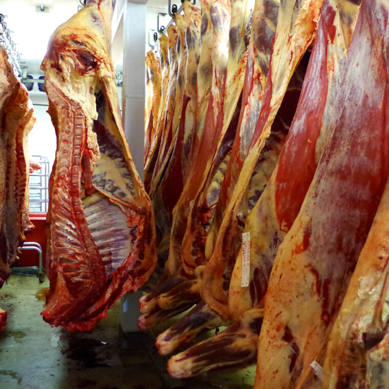 First thing, he let us peek at the meat he had on the rail that day. Back through a labyrinth of gray freezer doors, just past a ginormous hanging elk, we entered a bona fide Rocky Balboa training room. It was just honest, seeing so much beef hanging to cure all at once. Mike explained to us how most of the volume buyers sell by weight, so they don’t participate in a lengthy drying process because it reduced the overall mass too much, which is why most supermarket chain meat is sold on trays—to catch all the moisture. When your animal is custom however, it hangs for about 2 weeks before the butchering begins, and the flavor and tenderness is able to develop more fully that way.