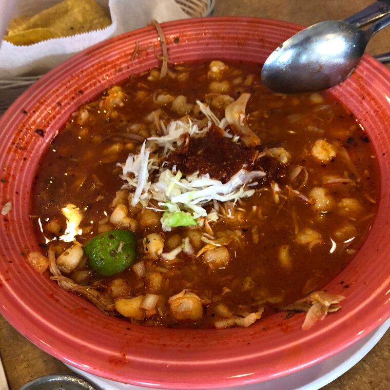 After devouring chips, beans, and many salsa samples, “I’VE NEVER HAD CHIPS THIS GOOD!” it was onto a first course of pozole. The boys had no idea what it was, but after properly loading up the soup with the plate of fresh accouterments–lime, chilies, shredded cabbage, diced onions and radishes–they tore into it like animals. Between the slurping, moaning, splashing and many and various incantations of “OH MY GOD!” it was easy to see the look of satisfaction and wonder on their faces. “I’VE NEVER HAD SOUP THIS GOOD!