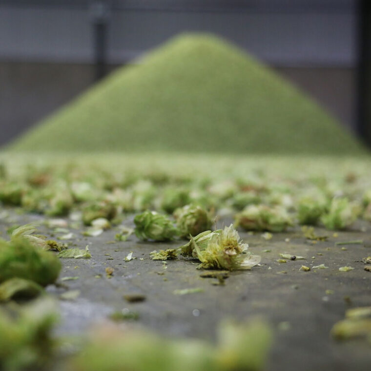 Sounds like the end of the line, but not so. The acids and oils in a hop degrade quickly. To extend their usage life, most hops are next converted into a pellet. The 200 lb. bales are pushed through a bale breaker to fracture the dense rectangles and then sent into a hammer mill.