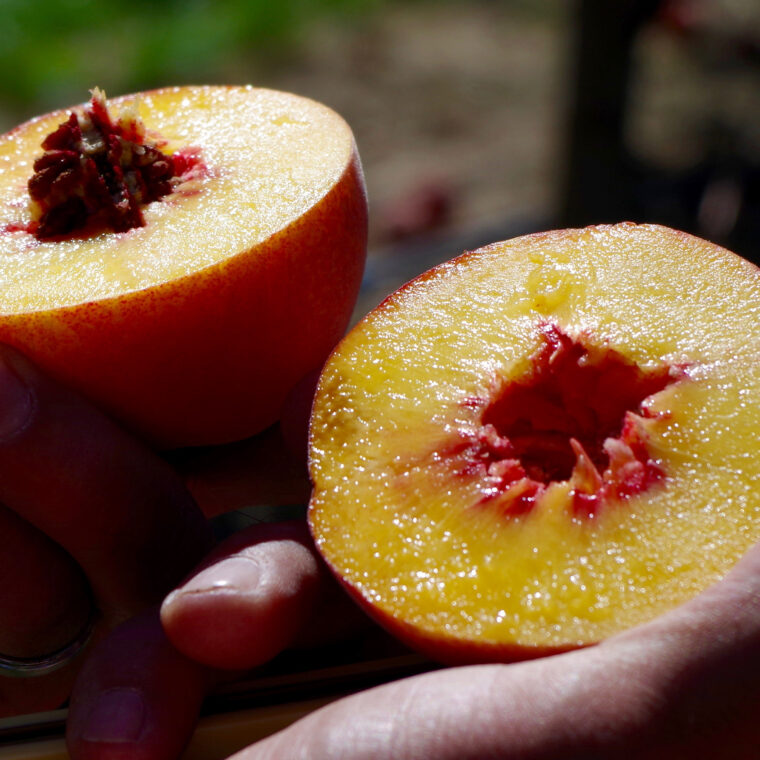 single peachMy face is covered in peachy detritus before I know it.  It feels so gluttonous, but it’s only one peach. As I wipe my face off and utter monosyllabic exclamations like “wow!” Rob explains that you can’t over water peaches or it will actually dilute their distinctive taste.  Slight water stress helps concentrate the flavor of the fruit better.  He cuts one in half for me and it truly glimmers in the sunshine.  He says that when ripe, the attached pit should pull away from the flesh easily.  He hands a half to me and I eat again.bucket peaches