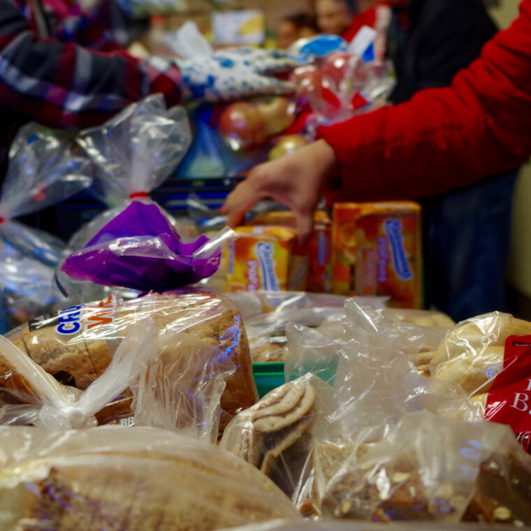 The line moves quickly, food is replaced, boxes and racks are moved out of the way, the food stores behind move forward. It’s an exercise in continuous motion for three straight hours. The place is buzzing in a gentle way. People come through with boxes, giant potato sacks, plastic or reusable bags, anything that works for them. There are volunteers dedicated to helping people out to their cars with their heavy loads if they need it. I end up at the bread station with Sue at the end of the line where I get to see the full boxes and bags and the contented people toting them. People are grateful, and happily so. The volunteers are warm and genuine. This place is where Thanksgiving lives. A coming together around food, where people on both sides of the line are happy to be there. When it’s over, the giant room full of food behind the line is nearly empty. Just under 500 families came through.