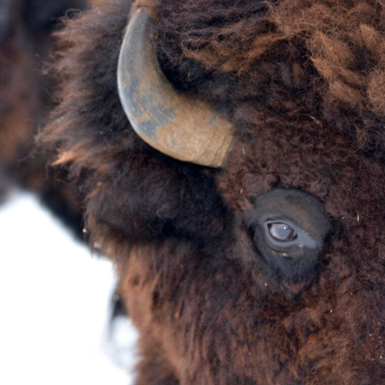 As I jump out of the car, I am surprised to sink just above my knees in the snow. Everything all around is white on white, except the beasts before me. Just on the other side of the fence are a herd of buffalo. Their giant bearded heads and humpbacks are a welcome contrast to the monochromatic winter scene around us.